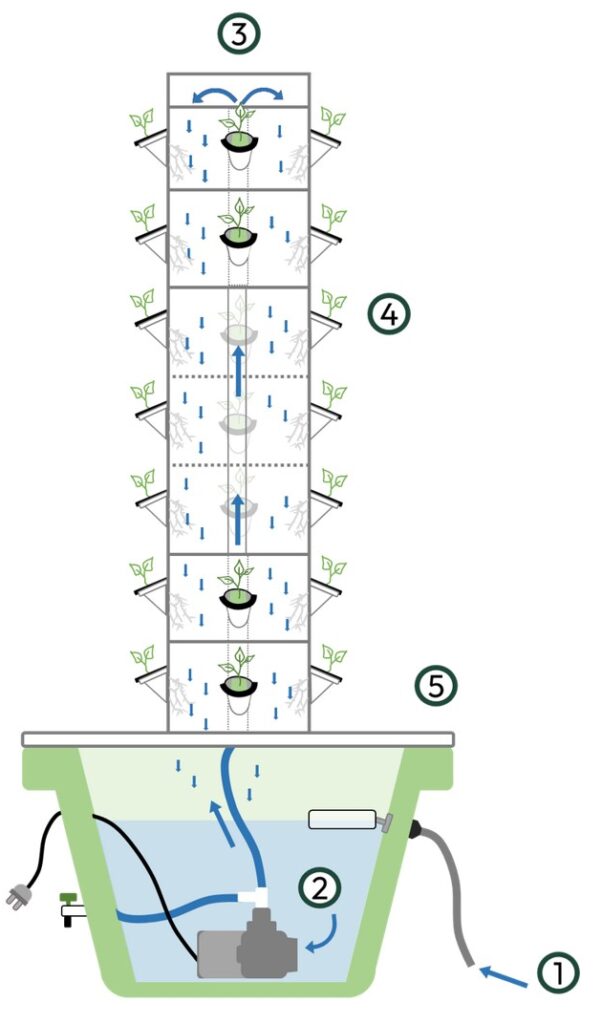 Une pompe immergée de faible puissance (45W) située dans le réservoir pousse la solution nutritive vers le haut de la tour par un petit tuyau central. La solution nutritive s’écoule ensuite à l’intérieur de la tour en cascade sur les racines des plants.